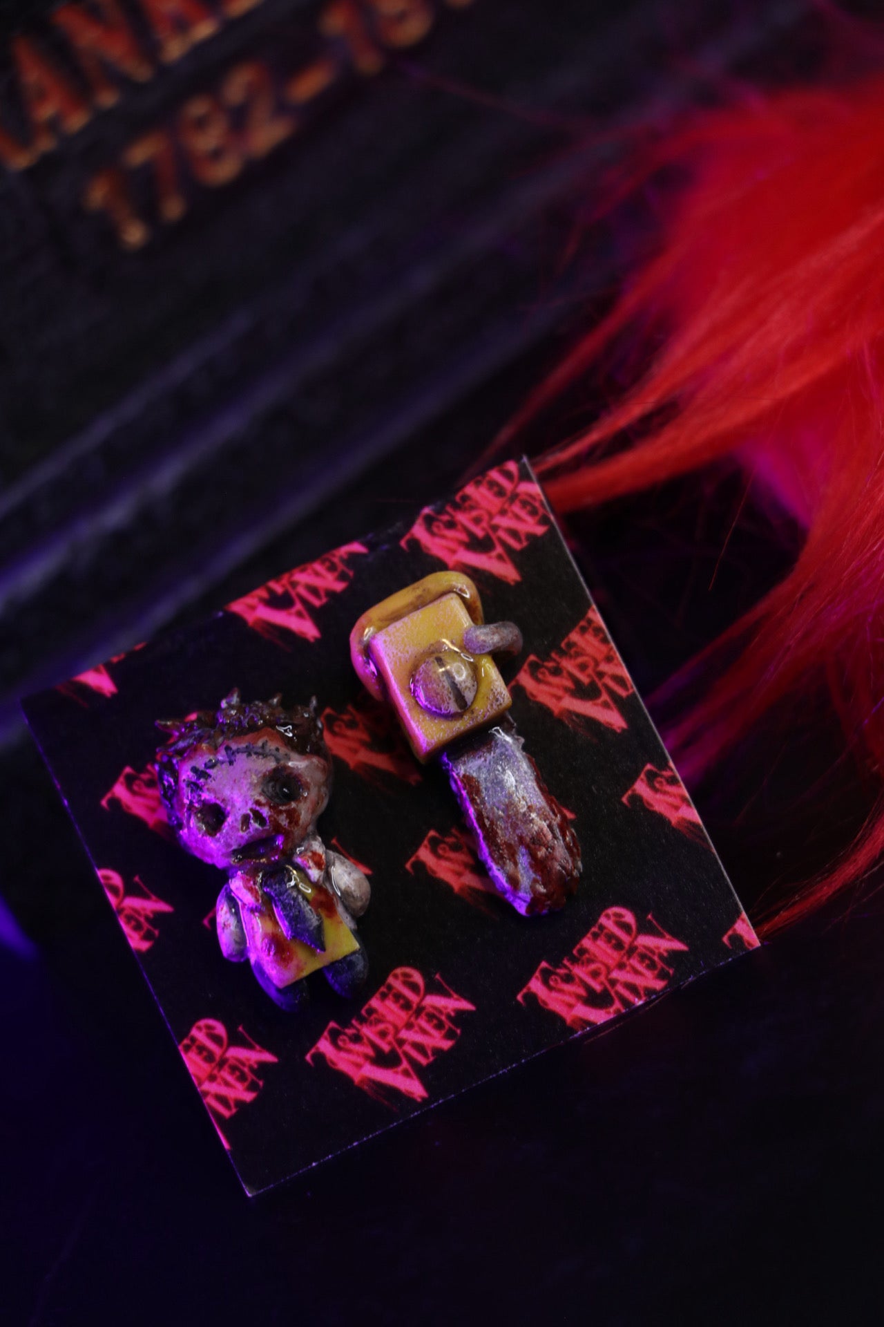 Make a statement with these edgy Texas Chainsaw studs—the perfect accessory for anyone who loves horror vibes with a fashion twist. Inspired by cult classic cinema, these bold studs bring that rebellious, slightly sinister charm to your everyday look. Whether you're channeling your inner horror fan or just want to add some attitude to your outfit, these studs deliver serious personality. Wear them loud, wear them proud, and let everyone know you've got killer style.